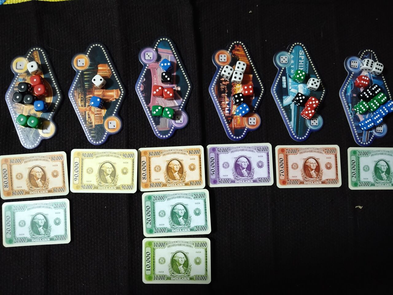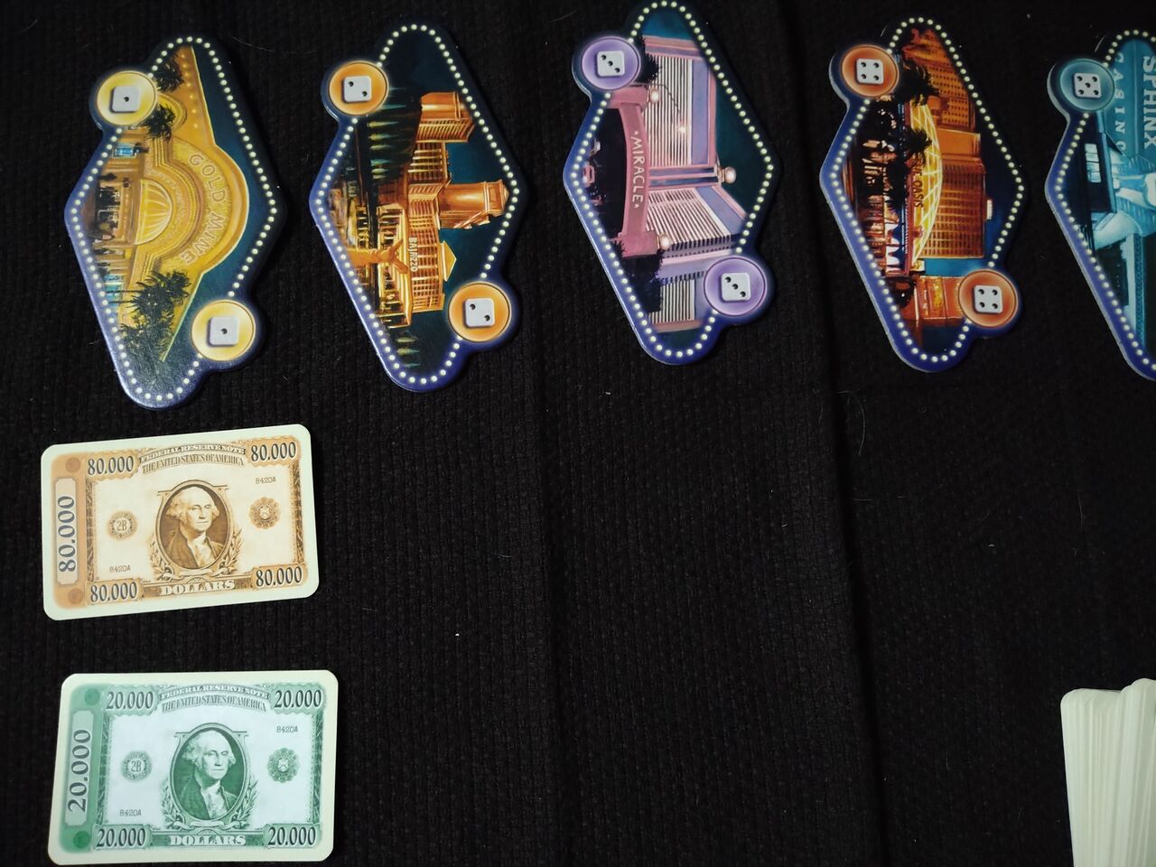 なので、黒のプレーヤーは単独で一番数が多いので、$80000を取ります。緑と赤は2個、白と青は1個で同じ数なので、賞金を獲得できずに、$20000は誰も獲れません。