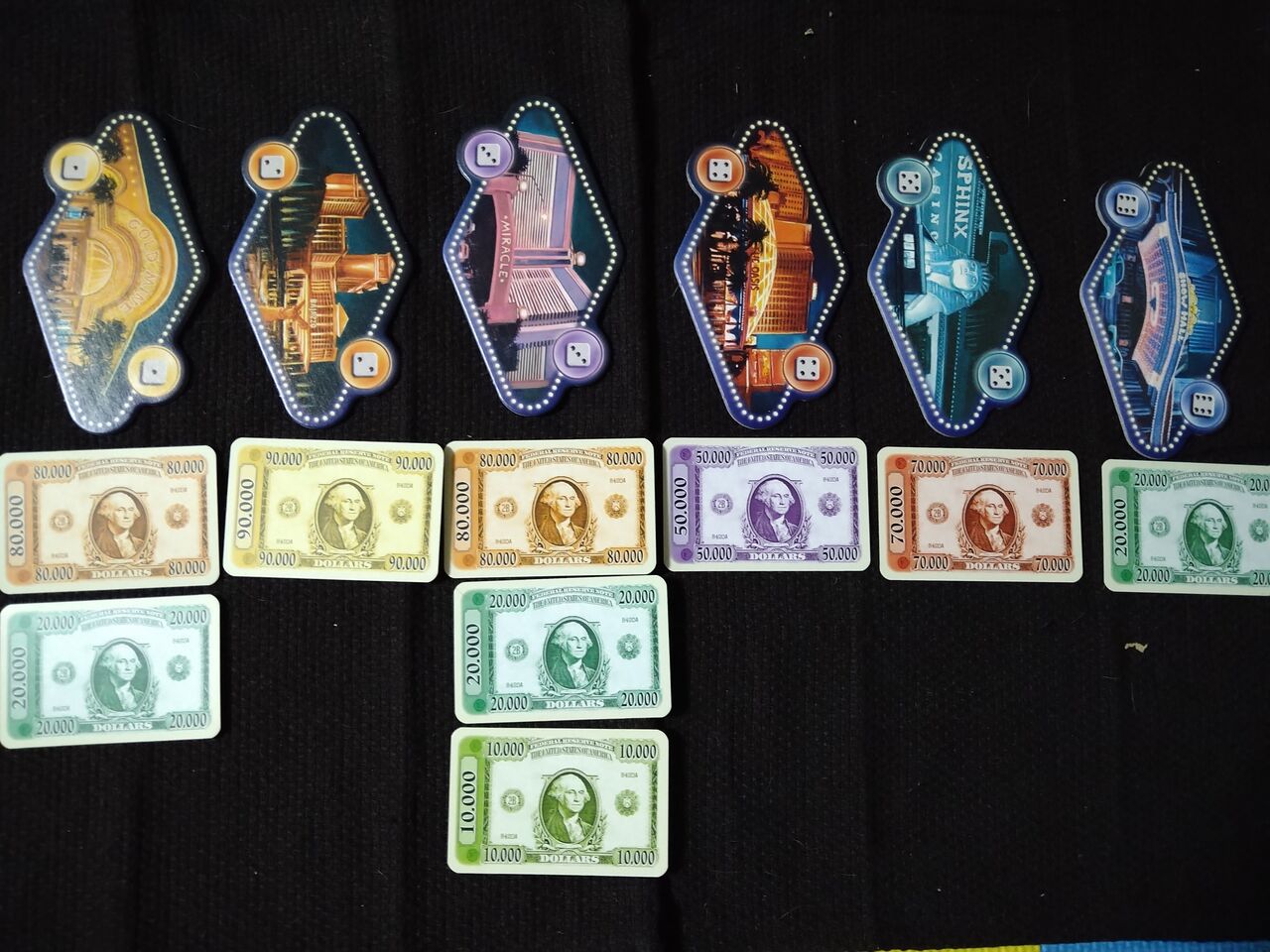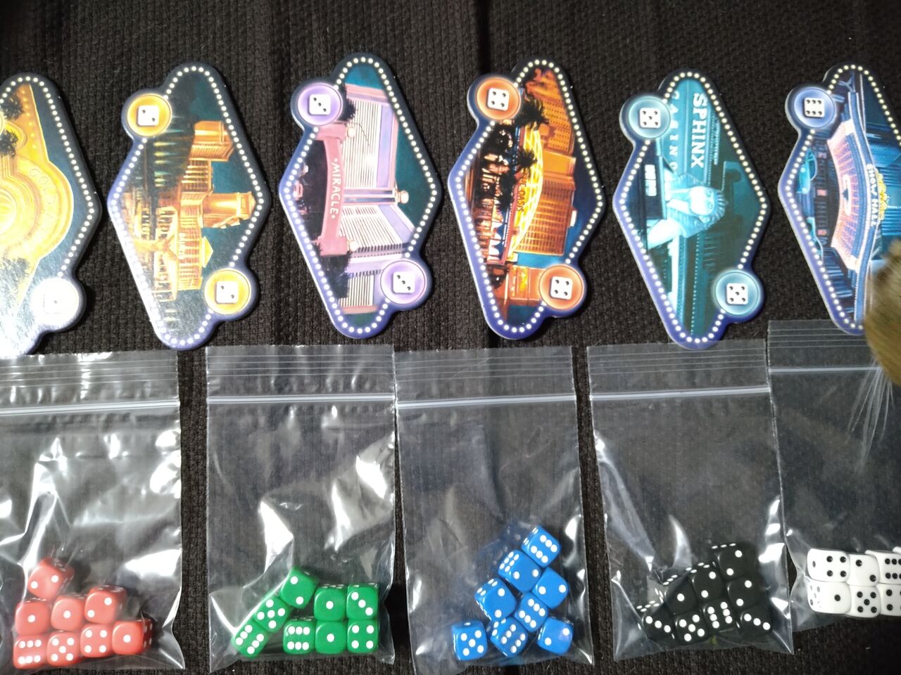 ラスベガスの有名な建物?の絵とサイコロの目が描かれたボードをサイコロの目の順番に並べていきます。
