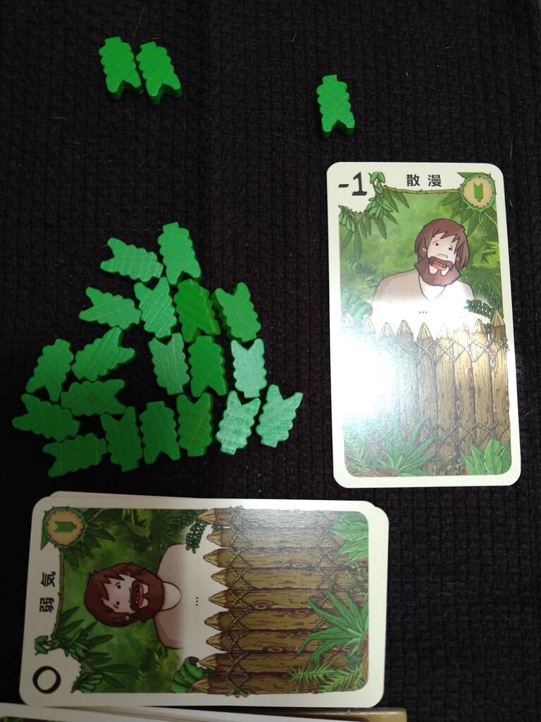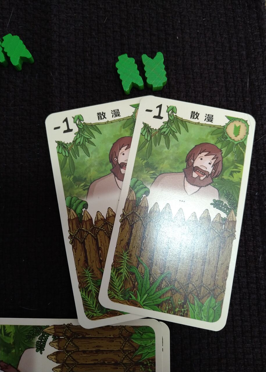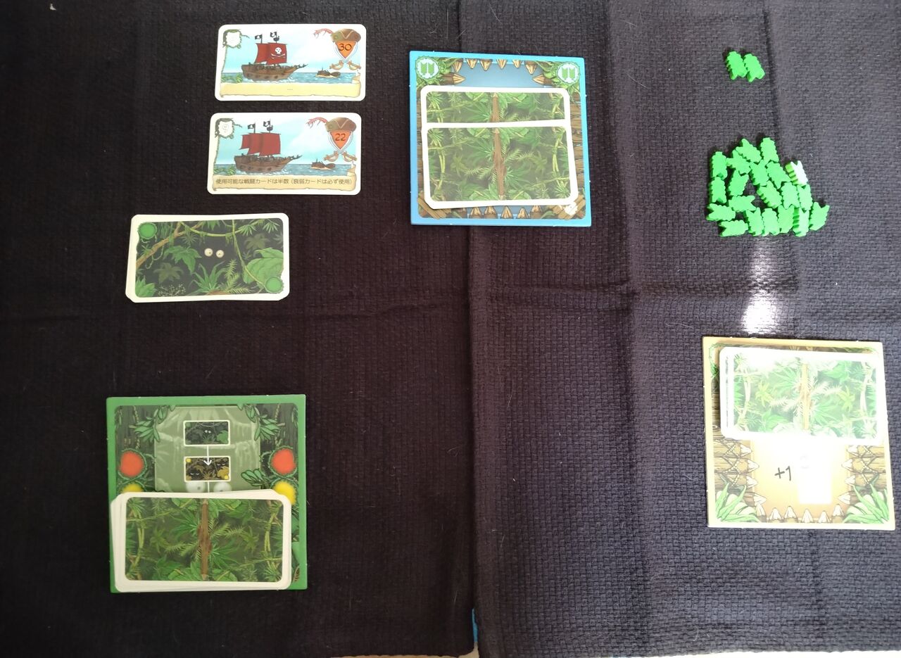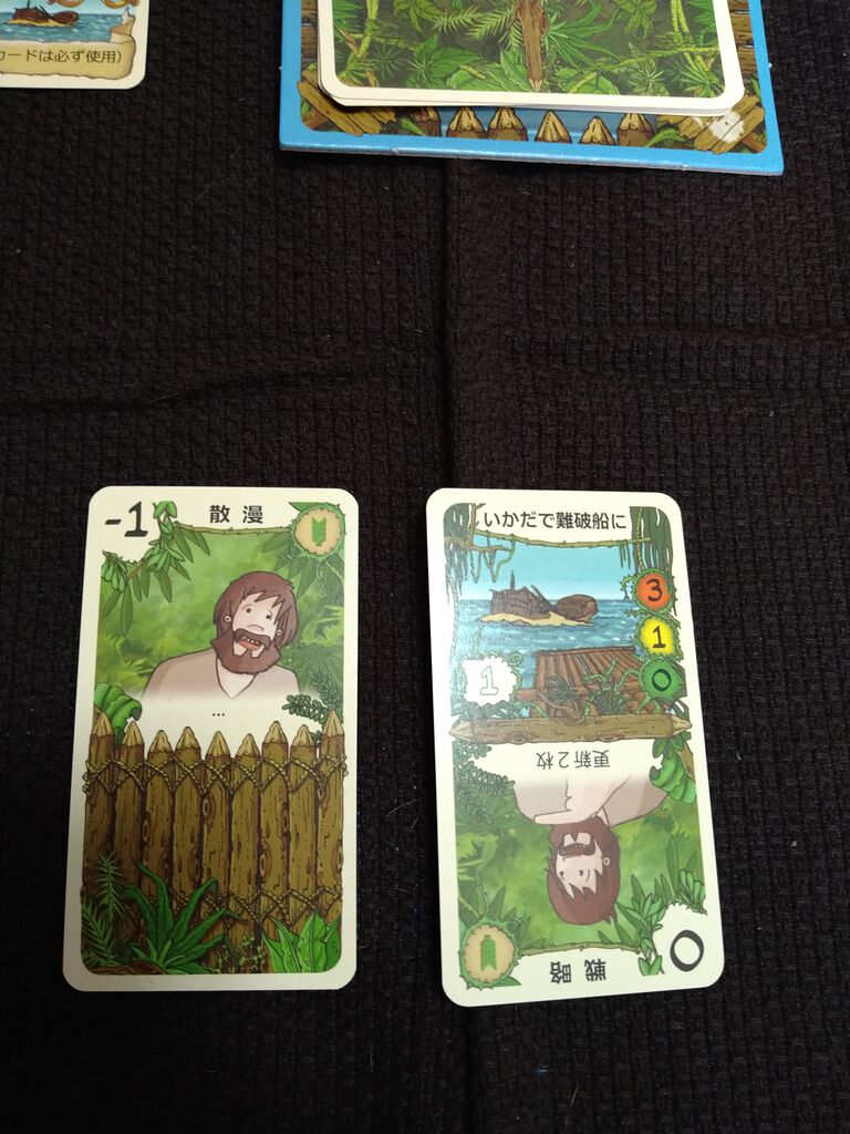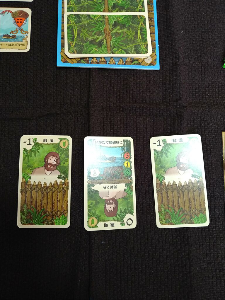 しかし、このとき、奪われた体力の文だけ、ロビンソン(漂着カード)か技能カードを捨てることができます。今回は2点少なく、体力が2奪われるので、写真のように2枚のカードを捨てることができました。